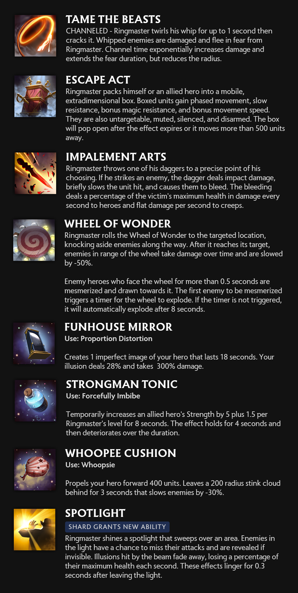 With a repertoire of abilities that would make any seasoned performer jealous, Ringmaster dazzles opponents with illusionary tricks, crowd control, and surprise elements that keep enemies guessing. He's not just bringing new tricks to the table; he's redefining the performance altogether. Players eager to master his act will find themselves orchestrating team fights with the precision and showmanship of a seasoned entertainer.